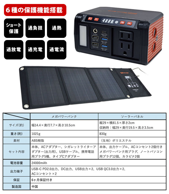 ●6ヶ月間保証付き ソーラーパネル&メガパワーバンク の詳細 商品名 ソーラーパネル&メガパワーバンク セット内容 【メガパワーバンク】 本体、ACアダプタ一、シガレットライターアダプター(出力用)、USBケーブル、携帯電話用プラグ5種、タイプCアダプター 【ソーラーパネル】 本体、出力ケーブル、ACコンセント2個付きメガパワーバンク用プラグ、ノートパソコン用プラグ12個、カラビナ2個 サイズ(約) 【メガパワーバンク】 幅14.4×奥行7.7×高さ10.5cm 【ソーラーパネル】 縦29×横81.5×厚さ2cm 収納時:幅29×奥行19.5×高さ3.5cm 重量(約) 【メガパワーバンク】1021g 【ソーラーパネル】830g 素材 【メガパワーバンク】ABS樹脂 【ソーラーパネル】(生地)ポリエステル 電池容量 24000mAh 出力端子 USB-C PD2.0出力、DC出力、USB出力×2、USB QC3.0出力×2、ACコンセント×2 保証 6ヶ月 製造国 中国 区分 防災グッズ 広告文責 (有)アテーネシステム 076-254-0238