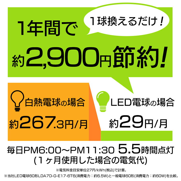 ●E17■商品サイズ(cm)直径約3.8×高さ約7.4■重量約46g■パッケージサイズ(cm)幅約8.0×奥行約4.0×高さ約8.0■口金サイズE17■光色LDA7D-G-E17-6T62P:昼光色相当LDA7N-G-E17-6T62P:昼白色相当LDA7L-G-E17-6T62P:電球色相当■定格消費電力6.5W■定格入力電流0.113A■全光束760lm■エネルギー消費効率116.9lm/W■ランプ全体の明るさ小形電球60W形相当■配光角約220°■定格寿命約40000時間■電源100V(50/60Hz共用)■使用場所屋内用■密閉形器具○■調光機能付器具×■誤挿入防止ソケット○■材質アルミ、ポリカーボネート、ナイロン ●E26■商品サイズ(cm)直径約5.5×高さ約10.1■重量約47g■パッケージサイズ(cm)幅約8.9×奥行約5.7×高さ約10.4■口金サイズE26■光色LDA7D-G-6T62P:昼光色相当LDA7N-G-6T62P:昼白色相当LDA7L-G-6T62P:電球色相当■定格消費電力6.9W■定格入力電流0.119A■全光束810lm■エネルギー消費効率117.3lm/W■ランプ全体の明るさ一般電球60W形相当■配光角約220°■定格寿命約40000時間■電源100V(50/60Hz共用)■使用場所屋内用■密閉形器具○■調光機能付器具×■材質アルミ、ポリカーボネート、ナイロン次のような器具には使用できません。