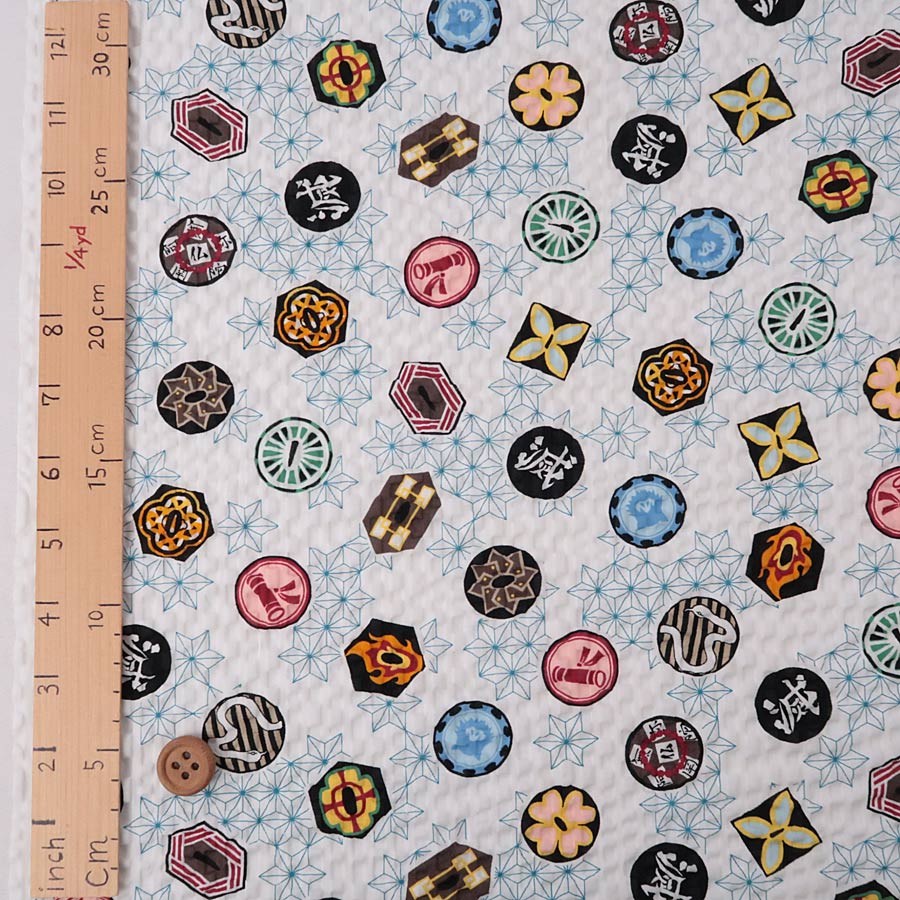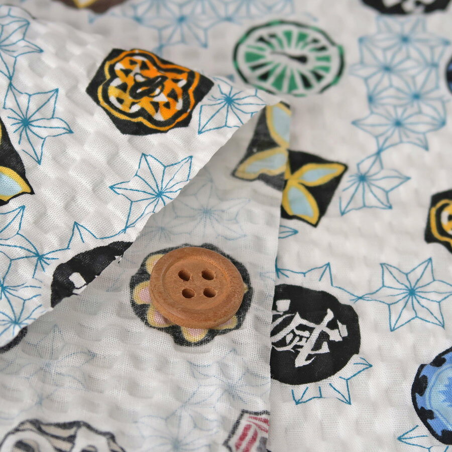 鬼滅の刃リップル生地 (白) 甚平・浴衣に!浴衣・甚平向き■綿100% ■約108cm幅生地の上のボタンは直径約2cmです。