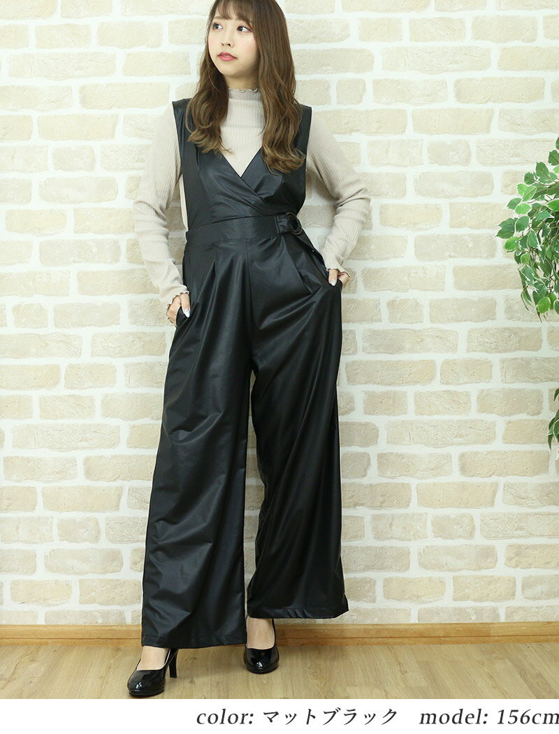 ■アイテム説明 人気の合皮×カシュクールデザインのコンビネゾン! パンツ部分は、ワイドタイプでゆったりリラックス感♪